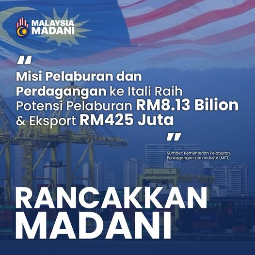 Dalam pada itu, Malaysia turut mohon sokongan Itali untuk menyelesaikan rundingan Perjanjian Perdagangan Bebas (FTA) Malaysia-EU.