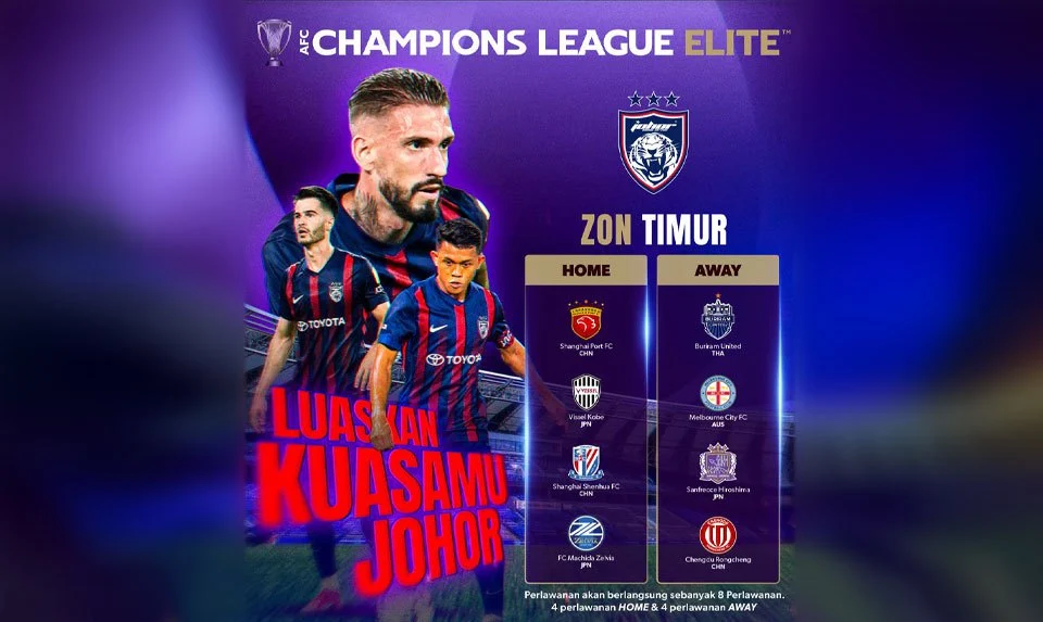 KUALA LUMPUR: Wakil tunggal negara dalam saingan Liga Juara-Juara Asia Elit (ACLE) 2025/26, Johor Darul Ta’zim (JDT) akan bertemu dua kelab Jepun dan dua kelab China dalam empat perlawanan di laman sendiri bagi Zon Timur musim ini.